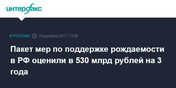 Москва. 18 декабря. INTERFAX.RU - Весь пакет мер по поддержке рождаемости в России, предложенный президентом, потребует 530 млрд рублей из федерального бюджета в течение трех лет, заявил министр труда и социальной защиты России Максим Топилин.