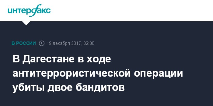 Москва. 19 декабря. INTERFAX.RU - Двое бандитов нейтрализованы в ходе контртеррористической операции (КТО) в Дагестане, сообщает в ночь на вторник информационный центр Национального антитеррористического комитета (НАК).