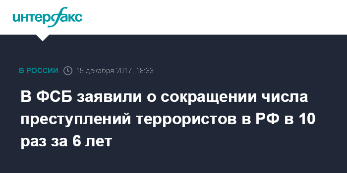 Москва. 19 декабря. INTERFAX.RU - Директор ФСБ России Александр Бортников заявил, что за последние шесть лет в России значительно снизилось количество преступлений террористической направленности.