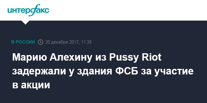 Москва. 20 декабря. INTERFAX.RU - Участница Pussy Riot Мария Алехина задержана в ходе акции у здания Федеральной службы безопасности в Москве. Об этом сообщила участница группы Ольга Борисова.