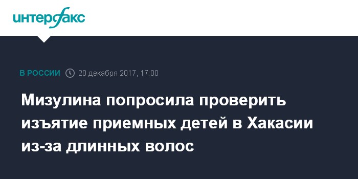 Москва. 20 декабря. INTERFAX.RU - Сенатор Елена Мизулина попросила Генпрокуратуру проверить законность изъятия в Хакасии семерых детей из приемной семьи из-за длинных волос одного из них.