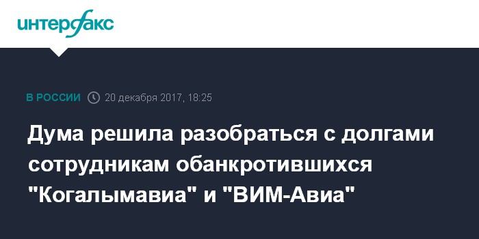 Москва. 20 декабря. INTERFAX.RU - Госдума в среду поручила комитету Думы по транспорту и строительству разобраться в ситуации с задолженностью по зарплатам сотрудникам авиакомпаний "Когалымавиа" и "ВИМ-Авиа", признанных банкротами.