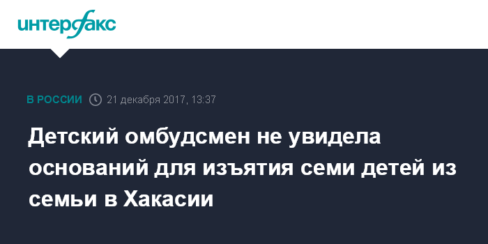 Москва. 21 декабря. INTERFAX.RU - Уполномоченный по правам ребенка в РФ Анна Кузнецова назвала античеловечными действия органов опеки в Хакасии в связи с изъятием из семьи семерых приемных детей.