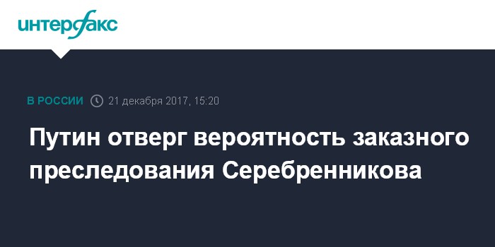 Москва. 21 декабря. INTERFAX.RU - Президент РФ Владимир Путин не согласен, что в отношении режиссера Кирилла Серебренникова ведется некое заказное преследование, а не уголовное расследование.