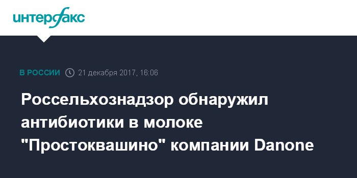 Москва. 21 декабря. INTERFAX.RU - Россельхознадзор в рамках пищевого мониторинга выявил антибиотики тетрациклиновой группы в молоке "Простоквашино", произведенном на молочном комбинате "Волгоградский" АО "Данон в России", сообщает служба.