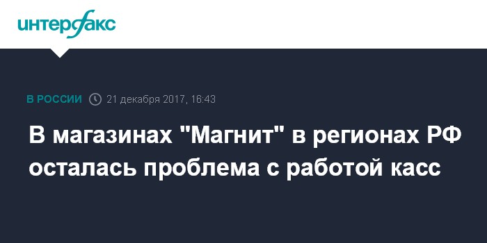Москва. 21 декабря. INTERFAX.RU - Магазины ритейлера "Магнит" во многих российских регионах второй день не выдают чеки из-за сбоя в работе онлайн-касс. Об этом сообщают корреспонденты "Интерфакса", посетившие в четверг супермаркеты сети.