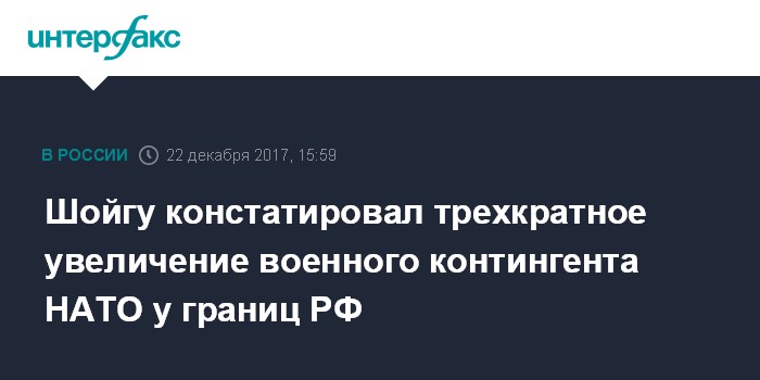 "С 2012 года численность размещенных военных контингентов НАТО у западных рубежей России увеличилась в три раза, а интенсивность проводимых ими учений - в два раза", - сказал Шойгу, выступая на коллегии Минобороны.
