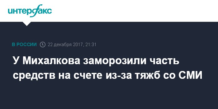 Ранее СМИ сообщали, что судебные приставы временно арестовали банковские счета кинорежиссера Никиты Михалкова, который не оплатил судебные издержки "ФедералПресс.Медиа" и "ФедералПресс" по делу о защите чести и достоинства. Отмечалось, что речь идет о суммах в 200 тыс. рублей за судебное представительство и 45 тыс. 638 руб. за транспортные расходы.