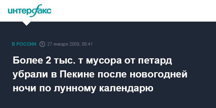 Пекин. 27 января. ИНТЕРФАКС-КИТАЙ - В понедельник - первый день Нового года по лунному календарю (Праздник весны) - городские коммунальные службы Пекина убрали с улиц города 2 тыс. 268 тонн мусора от петард и хлопушек, сообщи во вторник местные СМИ.