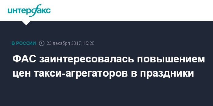 Москва. 23 декабря. INTERFAX.RU - Федеральная антимонопольная служба (ФАС) РФ может провести проверку в связи с сообщениями в соцсетях о завышении цен на услуги такси-агрегаторов в преддверии новогодних каникул, заявил журналистам замглавы ФАС Андрей Цариковский.