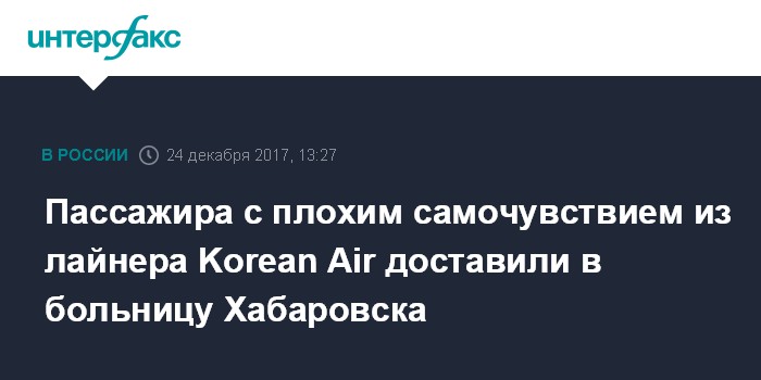 Москва. 24 декабря. INTERFAX.RU - Одного из пассажиров самолета авиакомпании Korean Air, который направлялся из Вашингтона в Сеул и экстренно сел в Хабаровске, госпитализировали в местную больницу, сообщили "Интерфаксу" в Управлении на транспорте МВД России по дальневосточному федеральному округу.