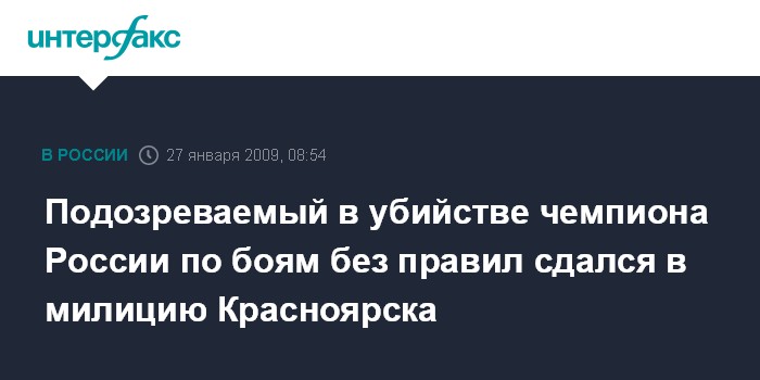 Красноярск. 27 января. INTERFAX.RU - Мужчина, подозреваемый в убийстве чемпиона России по боям без правил (панкратион) Закира Лалашова, явился с повинной в милицию Красноярска.