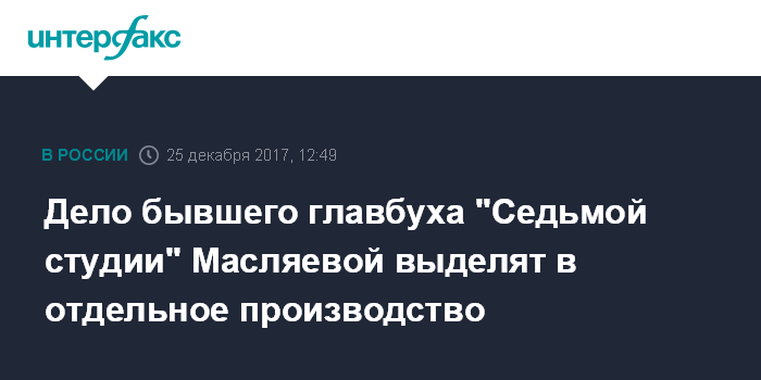 Москва. 25 декабря. INTERFAX.RU - Следствие до середины весны намерено выделить в отдельное производство уголовное дело бывшего главного бухгалтера "Седьмой студии" Нины Масляевой, признавшей вину в хищении бюджетных средств.