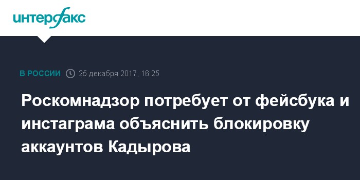 Москва. 25 декабря. INTERFAX.RU - Роскомнадзор направит запрос в фейсбук и инстаграм с требованием разъяснить причину блокировки аккаунтов главы Чечни Рамзана Кадырова.