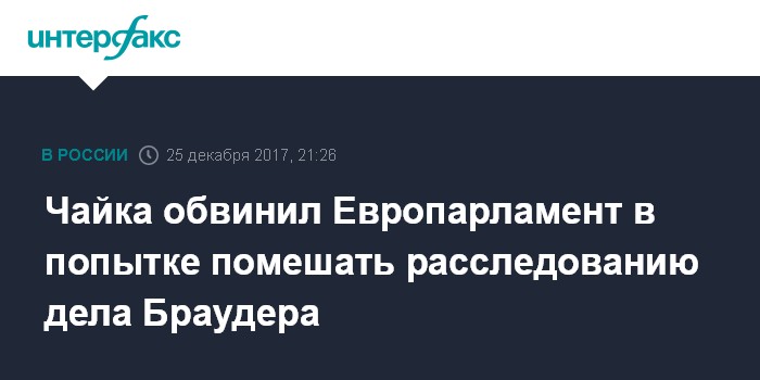 Москва. 25 декабря. INTERFAX.RU - Генеральный прокурор России Юрий Чайка считает недопустимым вмешательство группы депутатов Европарламента в расследование деятельности финансиста Уильяма Браудера и назвал эти действия давлением на правосудие.
