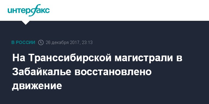 "26 декабря 2017 года в 21:09 мск восстановлено движение по второму пути перегона Бада - Жипхеген Читинского региона Забайкальской железной дороги. Движение поездов осуществляется в штатном режиме",- отмечается в сообщении на сайте компании.