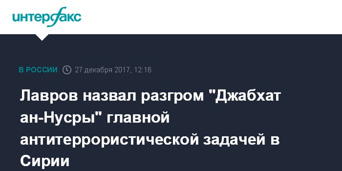 Москва. 27 декабря. INTERFAX.RU - Глава МИД РФ Сергей Лавров заявил, что разгром "Джабхат ан-Нусры" это главная антитеррористическая задача в Сирии после решающего удара по ИГИЛ.