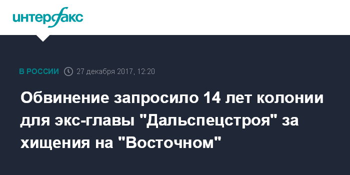 Москва. 27 декабря. INTERFAX.RU - Гособвинение потребовало длительные сроки заключения для фигурантов дела о хищении 5,2 млрд рублей при строительстве космодрома "Восточный".