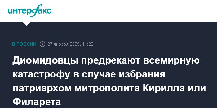 Москва. 27 января. INTERFAX.RU - Сторонники бывшего епископа Диомида предсказывают, что если на выборах патриарха победят митрополит Кирилл или Филарет, то это отзовется катастрофой в мировом масштабе.