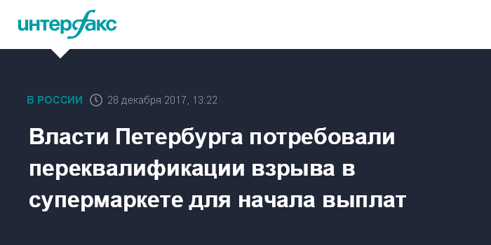 Москва. 28 декабря. INTERFAX.RU - Власти Петербурга подготовили проект документа о материальных выплатах пострадавшим в результате взрыва в супермаркете, но для его подписания необходима квалификация инцидента в теракт.