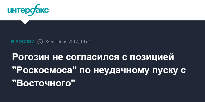 Москва. 28 декабря. INTERFAX.RU - Вице-премьер РФ Дмитрий Рогозин дал понять, что не согласен с позицией Роскосмоса по поводу неудачного запуска с космодрома "Восточный".