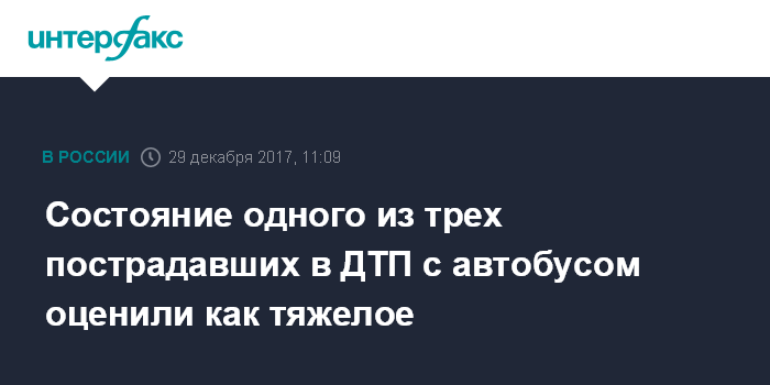 Москва. 29 декабря. INTERFAX.RU - Один из пострадавших в аварии с автобусом на Сходненской улице на северо-западе Москвы находится в тяжёлом состоянии, сообщил "Интерфаксу" в пятницу осведомлённый источник.