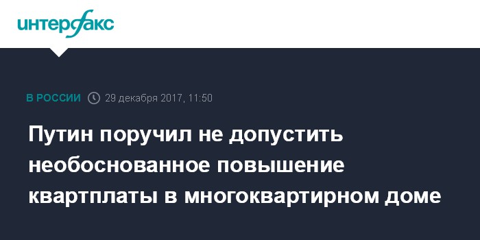 Москва. 29 декабря. INTERFAX.RU - Президент России Владимир Путин поручил правительству не допустить необоснованного повышения размера квартплаты в многоквартирных домах.