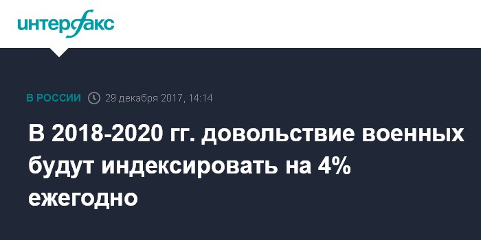 Москва. 29 декабря. INTERFAX.RU - Принято решение об индексации денежного довольствия военнослужащих и пенсий военным пенсионерам в 2018-2020 годах, сообщила в пятницу журналистам заместитель министра обороны Татьяна Шевцова.