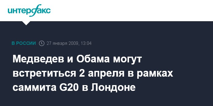 Москва. 27 января. INTERFAX.RU - Президенты России и США Дмитрий Медведев и Барак Обама могут провести двустороннюю встречу в ходе саммита "большой двадцатки", который состоится в Лондоне 2 апреля, сообщил глава МИД РФ Сергей Лавров.