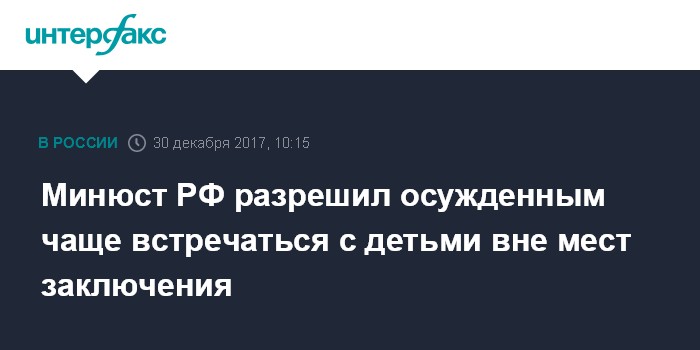 Москва. 30 декабря. INTERFAX.RU - Минюст распорядился чаще встречаться осужденным со своими детьми вне территории исправительных колоний.