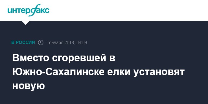 Москва. 1 января. INTERFAX.RU - Вместо сгоревшей в новогоднюю ночь 25-метровой главной ели в Южно-Сахалинске на площади Ленина поставят 12-метровую елку, сообщает пресс-служба мэрии областного центра в понедельник.