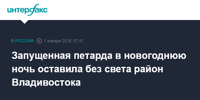 Москва. 1 января. INTERFAX.RU - Крупный район Владивостока в новогоднюю ночь оказался обесточенным, по предварительным данным, из-за запущенной петарды, сообщают местные СМИ.