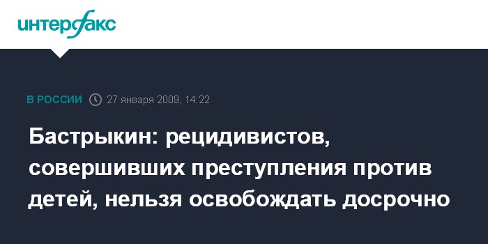 Москва. 27 января. INTERFAX.RU - Глава Следственного Комитета при прокуратуре РФ Александр Бастрыкин считает, что рецидивисты, совершившие преступления в отношении детей, не могут получать условно-досрочное освобождение из мест лишения свободы.