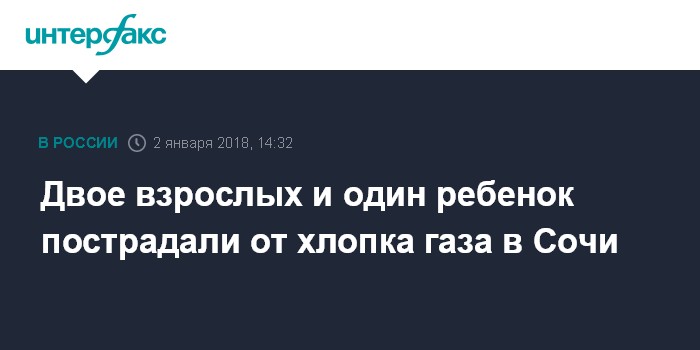 В свою очередь в управлении здравоохранения Сочи агентству сказали, что от взрыва газа в частном доме пострадали три человека. "Двое взрослых и один ребенок пострадали от хлопка газа в частном домостроении. Все они находятся в больнице", - сообщил представитель администрации города.