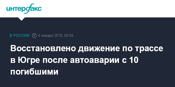 Москва. 4 января. INTERFAX.RU - Движение по автодороге Ханты-Мансийск - Нягань, на которой в среду произошла авария, унесшая жизни десяти человек, возобновлено, сообщил "Интерфаксу" пресс-секретарь Главного управления МЧС по Югре Вадим Симоненко.