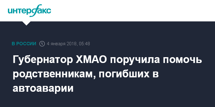 Москва. 4 января. INTERFAX.RU - Губернатор Ханты-Мансийского автономного округа (ХМАО) Наталья Комарова дала поручение оказать необходимое содействие родственникам погибших в дорожно-транспортном происшествии на трассе Ханты-Мансийск - Нягань, сообщает официальный штаб правительства региона.