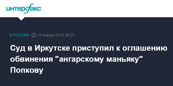 Ранее сообщалось, что Иркутский облсуд принял решение вести судебное разбирательство по делу "ангарского маньяка" в открытом режиме, за исключением эпизодов, связанных с сексуальным насилием - они будут рассматриваться в закрытом режиме. Всего таких эпизодов в деле более десяти. Кроме того, облсуд продлил Попкову заключение под стражей в СИЗО до июня 2018 года.