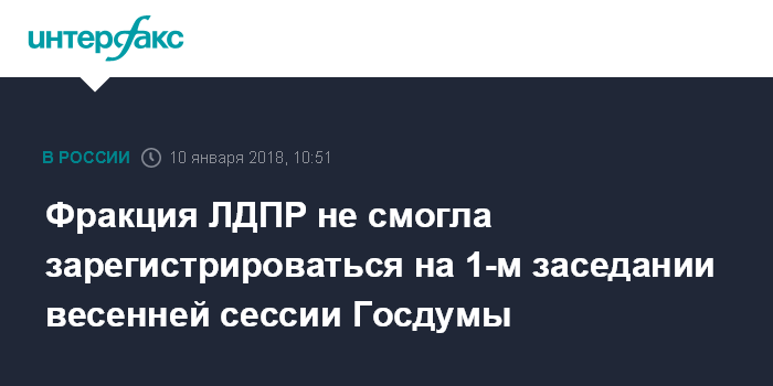 Москва. 10 января. INTERFAX.RU - Первое заседание весенней сессии Госдумы во вторник началось в условиях отсутствия технической возможности официально зарегистрировать в зале депутатов фракции ЛДПР.