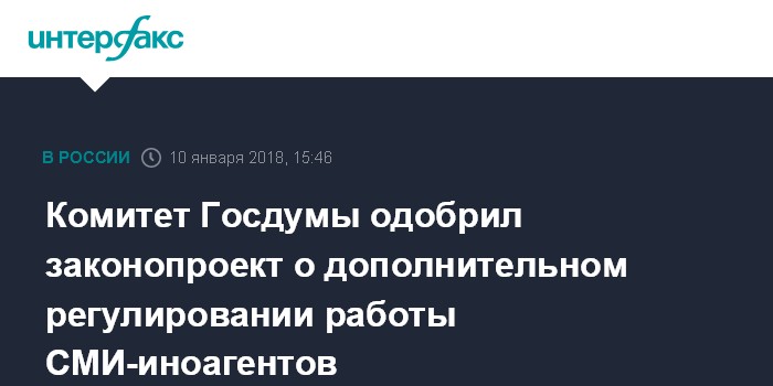 Москва. 10 января. INTERFAX.RU - Комитет Госдумы по информационной политике, информационным технологиям и связи во вторник одобрил к первому чтению законопроект о дополнительном регулировании деятельности СМИ - иностранных агентов.