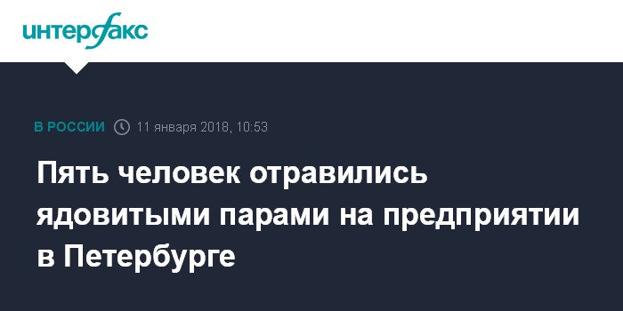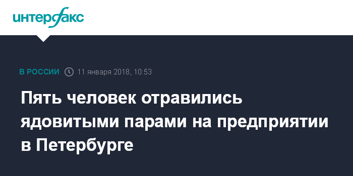 Москва. 11 января. INTERFAX.RU - Тело мужчины, отравившегося химикатами, обнаружили на территории предприятия в Пушкинском районе Петербурга, откуда позже госпитализировали четырех человек. Об этом сообщил "Интерфаксу" информированный источник в среду.