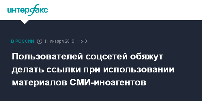 Москва. 11 января. INTERFAX.RU - Пользователи соцсетей, например Facebook, перепечатывая на своих страницах материалы и сообщения от СМИ-иностранного агента, должны будут делать специальные ссылки, заявил вице-спикер Госдумы Петр Толстой.