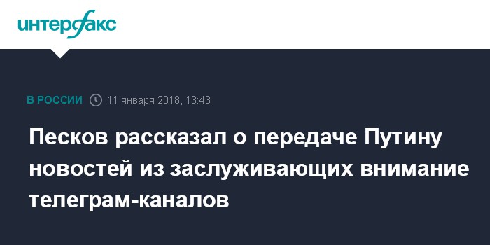 Москва. 11 января. INTERFAX.RU - Президенту РФ Владимиру Путину докладывают о новостях из телеграм-каналов, но только из тех, которые заслуживают внимания, сообщил журналистам в четверг пресс-секретарь главы государства Дмитрий Песков.