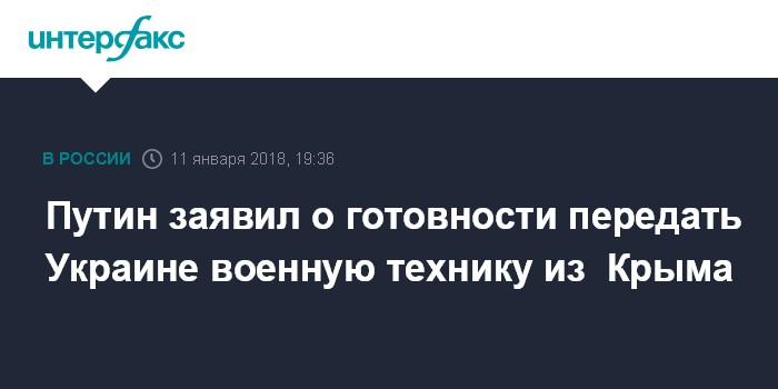 Москва. 11 января. INTERFAX.RU - Президент РФ Владимир Путин заявил, что Россия готова передать украинской стороне ее боевую технику, оставшуюся в Крыму после ухода оттуда Вооруженных сил Украины.