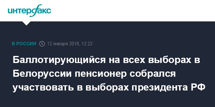 Москва. 12 января. INTERFAX.RU - Житель Минска, который пытается на каждых выборах в Белоруссии - от местных до президентских - стать кандидатом, вознамерился стать президентом России.