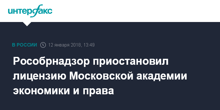 Москва. 12 января. INTERFAX.RU - Федеральная служба по надзору в сфере образования и науки (Рособрнадзор) в пятницу приостановила действие лицензии Московской академии экономики и права.