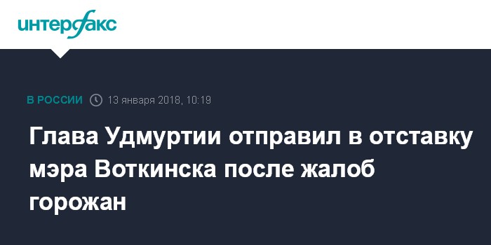 Москва. 13 января. INTERFAX.RU - Глава Удмуртии Александр Бречалов в субботу отправил в отставку главу города Воткинска Владимира Перевозчикова из-за многочисленных жалоб от жителей, сообщает пресс-служба удмуртского руководителя.
