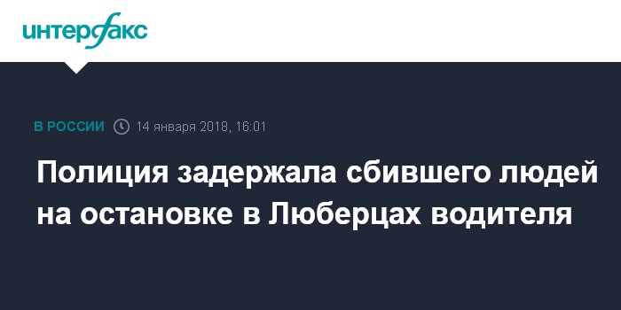 Москва. 14 января. INTERFAX.RU - Полиция задержала водителя сбившего двух женщин в Люберцах, сообщила официальный представитель МВД Ирина Волк.