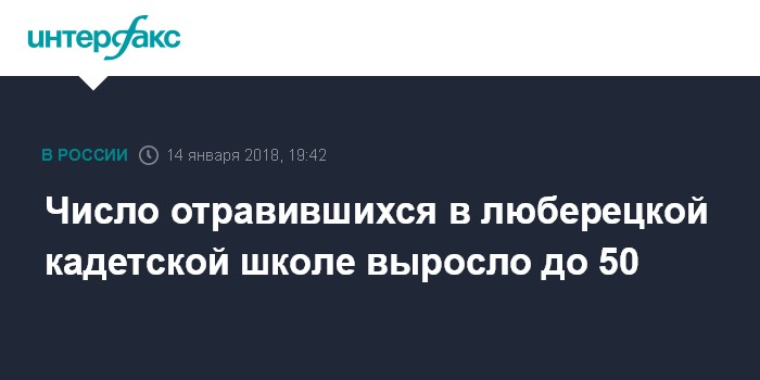 Москва. 14 января. INTERFAX.RU - Количество госпитализированных после отравления в кадетской школе в Люберцах увеличилось до 50, сообщили "Интерфаксу" в пресс-службе министерства здравоохранения Московской области.