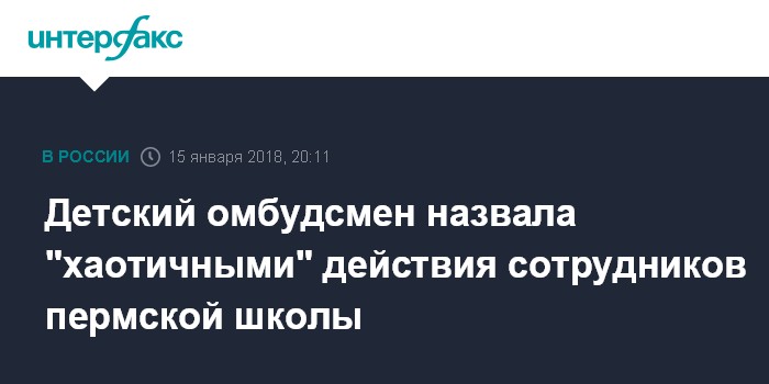 Москва. 15 января. INTERFAX.RU - Уполномоченный при президенте РФ по правам ребенка Анна Кузнецова раскритиковала действия сотрудников школы N127 в Перми, где произошла поножовщина с 15 пострадавшими, назвав их "хаотичными" и "нелогичными".
