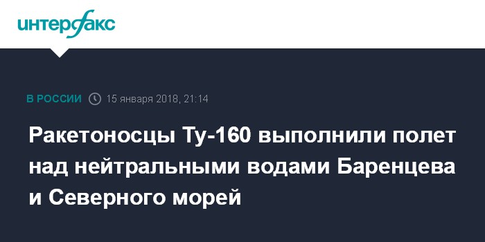 Москва. 15 января. INTERFAX.RU - Два стратегических ракетоносца Ту-160 выполнили многочасовой плановый полет над нейтральными водами акваторий Баренцева, Норвежского и Северного морей, сообщили "Интерфаксу" в понедельник в Министерстве обороны России.